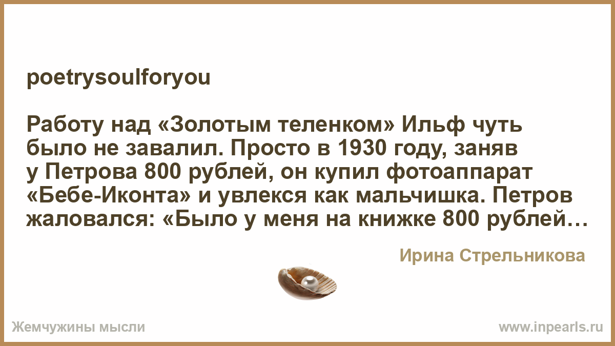 Работу над «Золотым теленком» Ильф чуть было не завалил. Просто в 1930 году, заняв у Петрова 800 рублей, он купил фотоаппарат «Бебе-Иконта» и увлекся как мальчишка. Петров жаловался: «Было у меня на книжке 800 рублей, и был чудный соавтор. А теперь Иля увлекся фотографией. Я одолжил ему мои 800 рублей на покупку фотоаппарата. И что же? Нет у меня больше ни денег, ни соавтора… Мой бывший соавтор только снимает, проявляет и печатает. Печатает, проявляет и снимает. И даже консервы он теперь открывает при красном свете, чтобы не засветить». Что он фотографировал? Да все подряд: жену, Олешу, фетровые боты, разрушение храма Христа Спасителя (Ильф наблюдал весь процесс из собственного окна в Соймоновском проезде), сценки городской жизни и, конечно, Петрова. У него, как говорят фотографы, был «свой глаз». Ильф снова наблюдал и делал зарисовки: ироничные, добрые, немного печальные. Но теперь уже не словами, а камерой. «Иля, Иля, пойдемте же трудиться!» — тщетно взывал Петров, имея в виду, что труд может быть только писательским, а фотография — баловство. Впрочем, им действительно, нужно было торопиться: издательство чуть было не разорвало с писателями контракт. Впрочем, они все-таки успели.