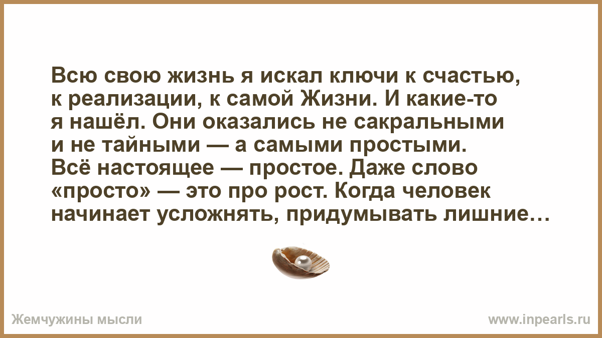 Всю свою жизнь я искал ключи к счастью, к реализации, к самой Жизни. И какие-то я нашёл. Они оказались не сакральными и не тайными — а самыми простыми.
