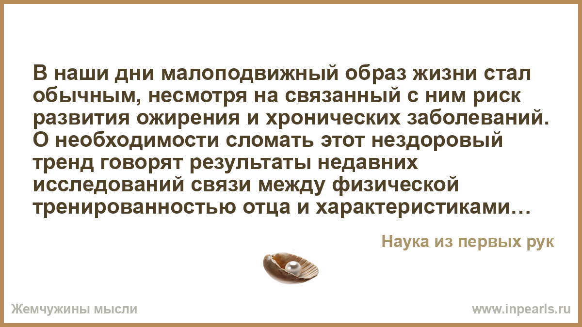 В наши дни малоподвижный образ жизни стал обычным, несмотря на связанный с ним риск развития ожирения и хронических заболеваний. О необходимости сломать этот нездоровый тренд говорят результаты недавних исследований связи между физической тренированностью отца и характеристиками обмена веществ у потомства