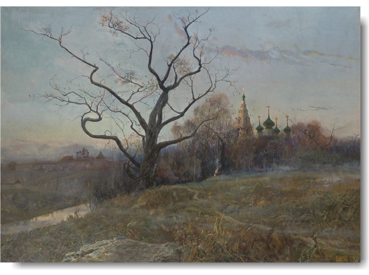 Ветки тянутся к небу голыми руками, словно в прощальной молитве к уходящему солнцу. Воздух в картине прозрачен, будто наполнен лёгкой дымкой, предвещающей скорый холод и зиму.