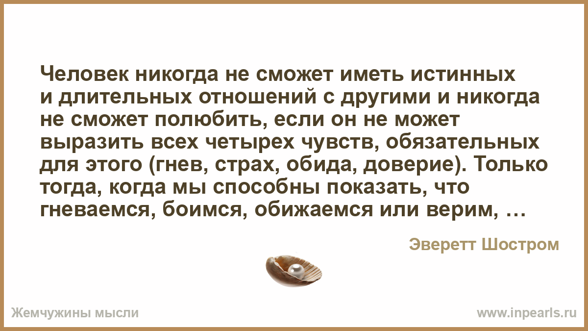 Человек никогда не сможет иметь истинных и длительных отношений с другими и никогда не сможет полюбить, если он не может выразить всех четырех чувств, обязательных для этого (гнев, страх, обида, доверие). Только тогда, когда мы способны показать, что гневаемся, боимся, обижаемся или верим, — только тогда мы сможем полюбить. Только тогда, когда мы можем открыто показать друг другу свои чувства и сказать открыто о них, — только тогда мы сможем почувствовать душевную близость — что, кстати, ничуть не менее приятно, чем близость физическая.
