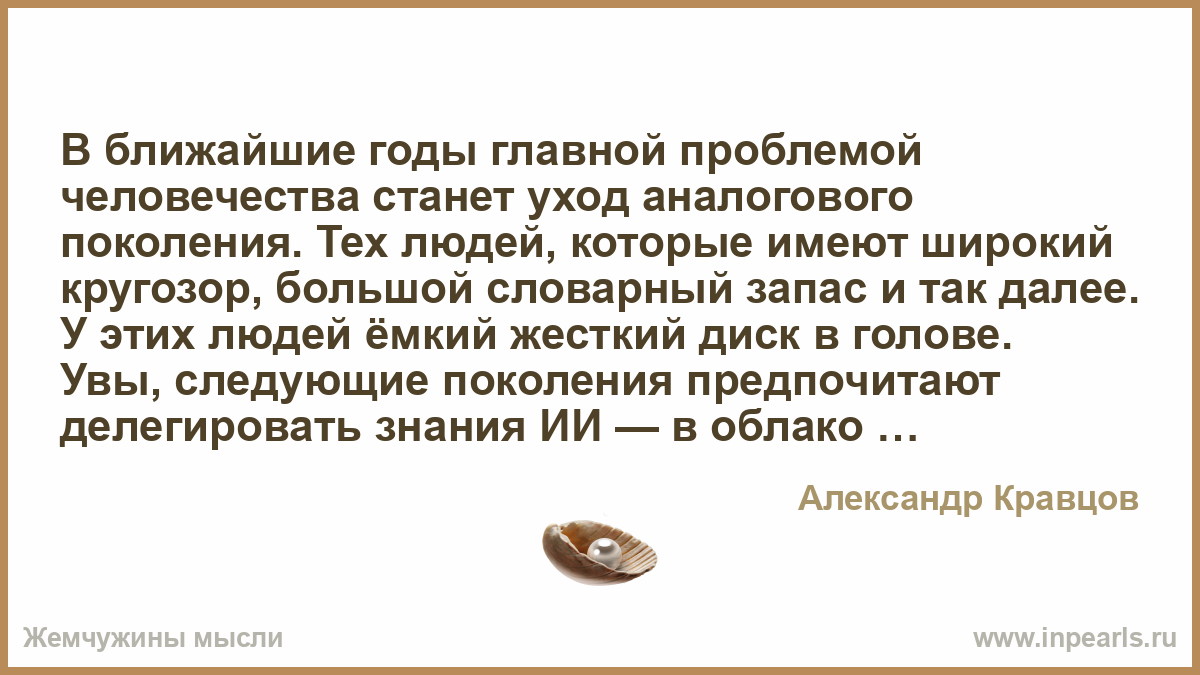 В ближайшие годы главной проблемой человечества станет уход аналогового поколения. Тех людей, которые имеют широкий кругозор, большой словарный запас и так далее. У этих людей ёмкий жесткий диск в голове.