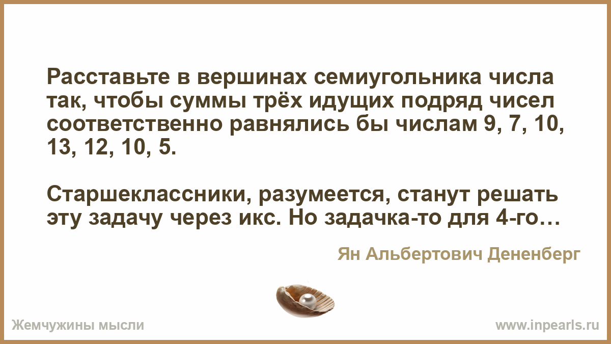 Расставьте в вершинах семиугольника числа так, чтобы суммы трёх идущих подряд чисел соответственно равнялись бы числам 9, 7, 10, 13, 12, 10, 5.
