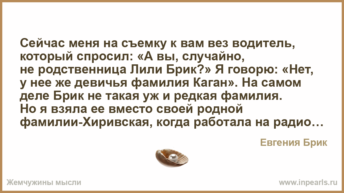 Сейчас меня на съемку к вам вез водитель, который спросил: «А вы, случайно, не родственница Лили Брик?» Я говорю: «Нет, у нее же девичья фамилия Каган». На самом деле Брик не такая уж и редкая фамилия. Но я взяла ее вместо своей родной фамилии-Хиривская, когда работала на радио: там стало понятно, что моя не звучит. А назвали меня в честь дедушки по папиной линии, Евгения Абрамовича Крейна, который был известным журналистом. К сожалению, дедушку я не застала, он умер от инфаркта до моего рождения, как и его маму Софью Брик, мою прабабушку, фамилию которой я сейчас ношу.