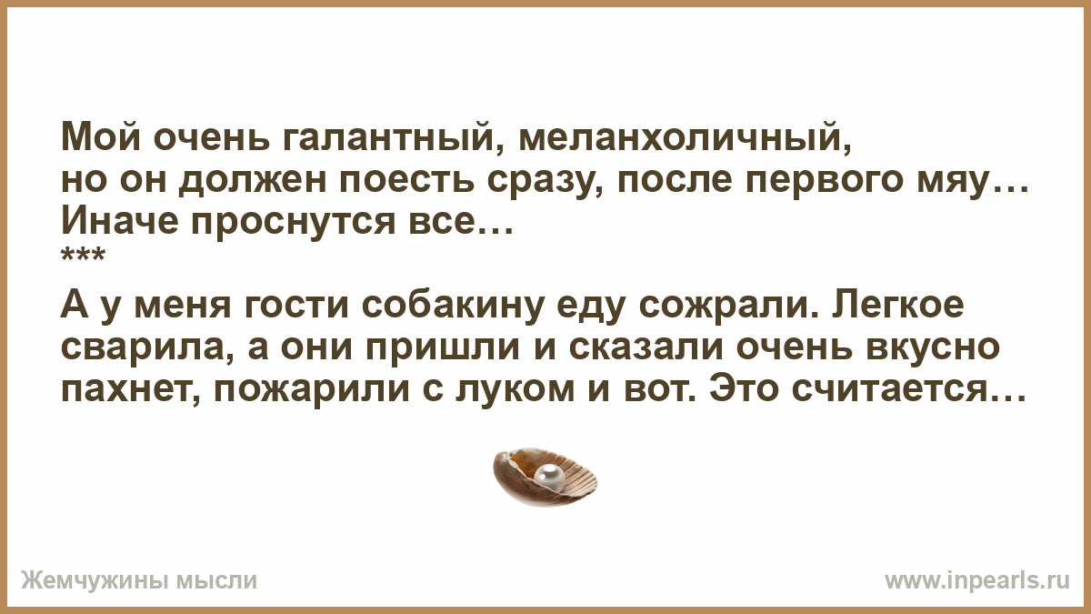 Мой очень галантный, меланхоличный, но он должен поесть сразу, после первого мяу… Иначе проснутся все…