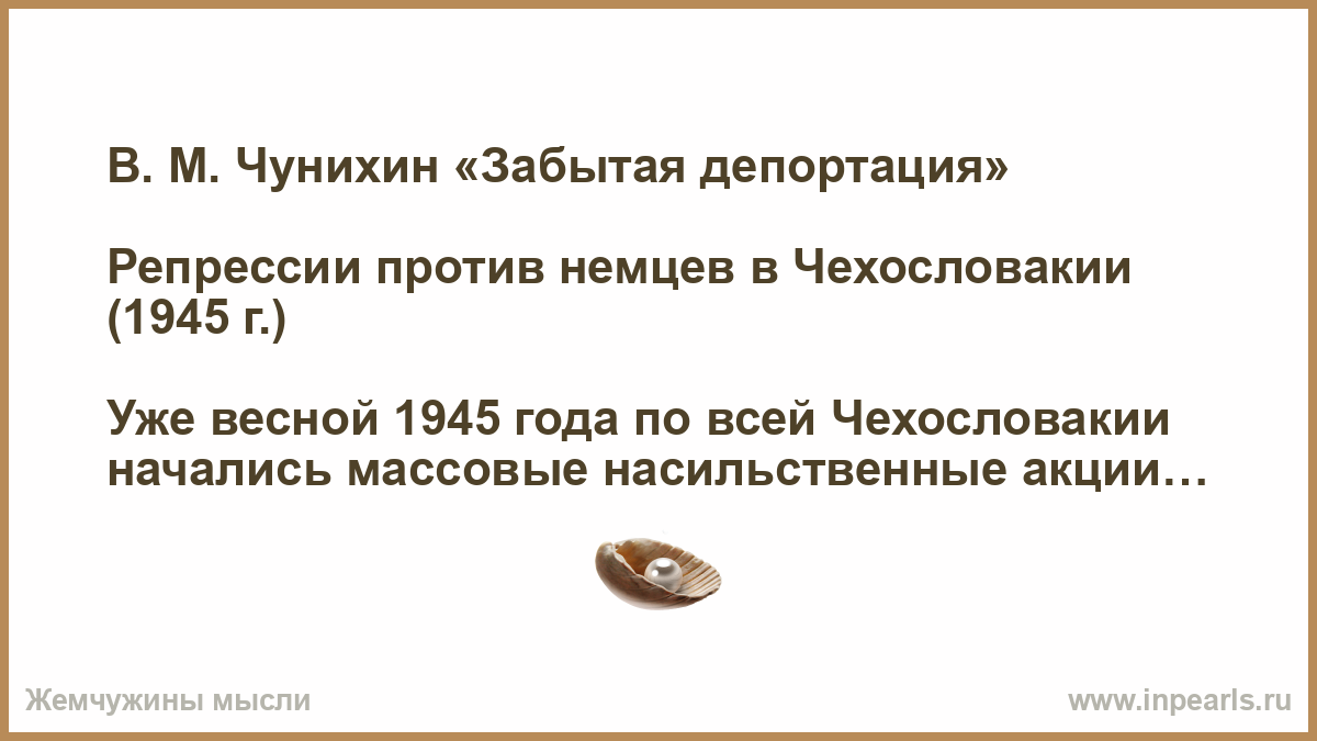 Благородное возмущение освобождённых чехов обретало тем большую силу, чем скорее они осознавали свою полную безнаказанность. Речь шла уже не о насилии к единицам или даже группам немцев. В те времена отвечать за содеянное нацистами пришлось целым городам, населённым преимущественно немцами. Я уже молчу про деревни и деревеньки.