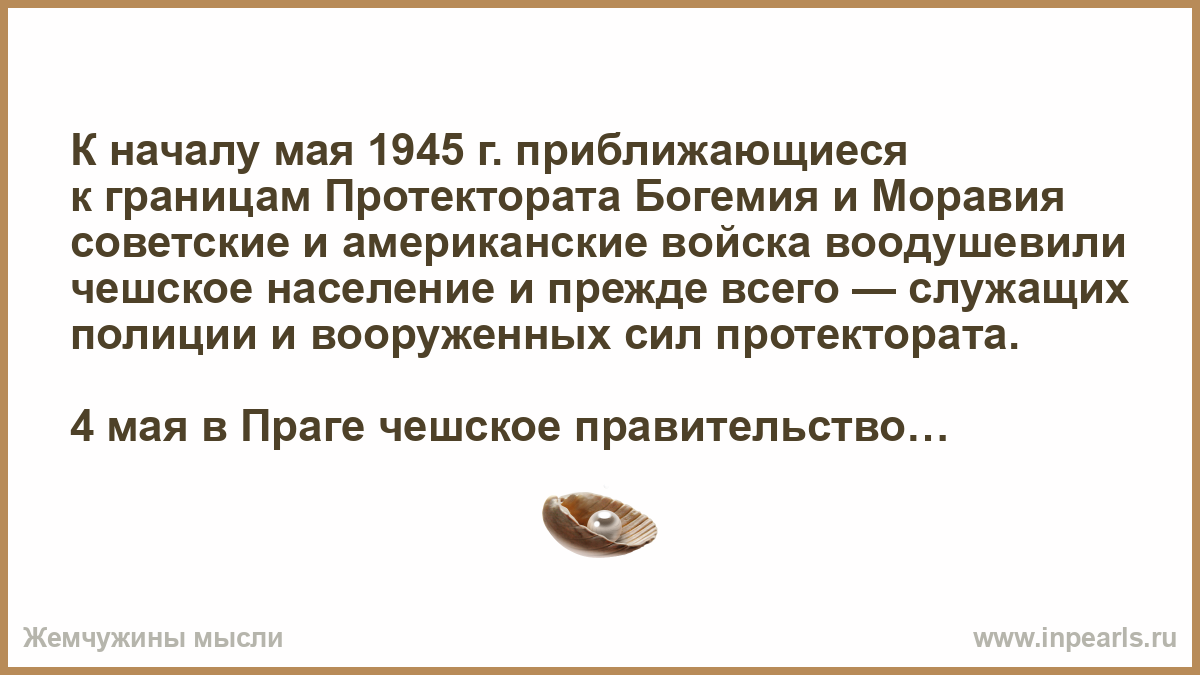 К началу мая 1945 г. приближающиеся к границам Протектората Богемия и Моравия советские и американские войска воодушевили чешское население и прежде всего — служащих полиции и вооруженных сил протектората.