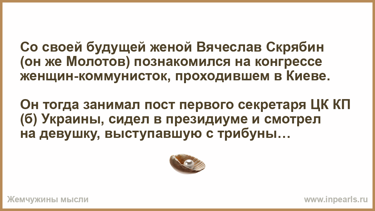 Со своей будущей женой Вячеслав Скрябин (он же Молотов) познакомился на конгрессе женщин-коммунисток, проходившем в Киеве.
