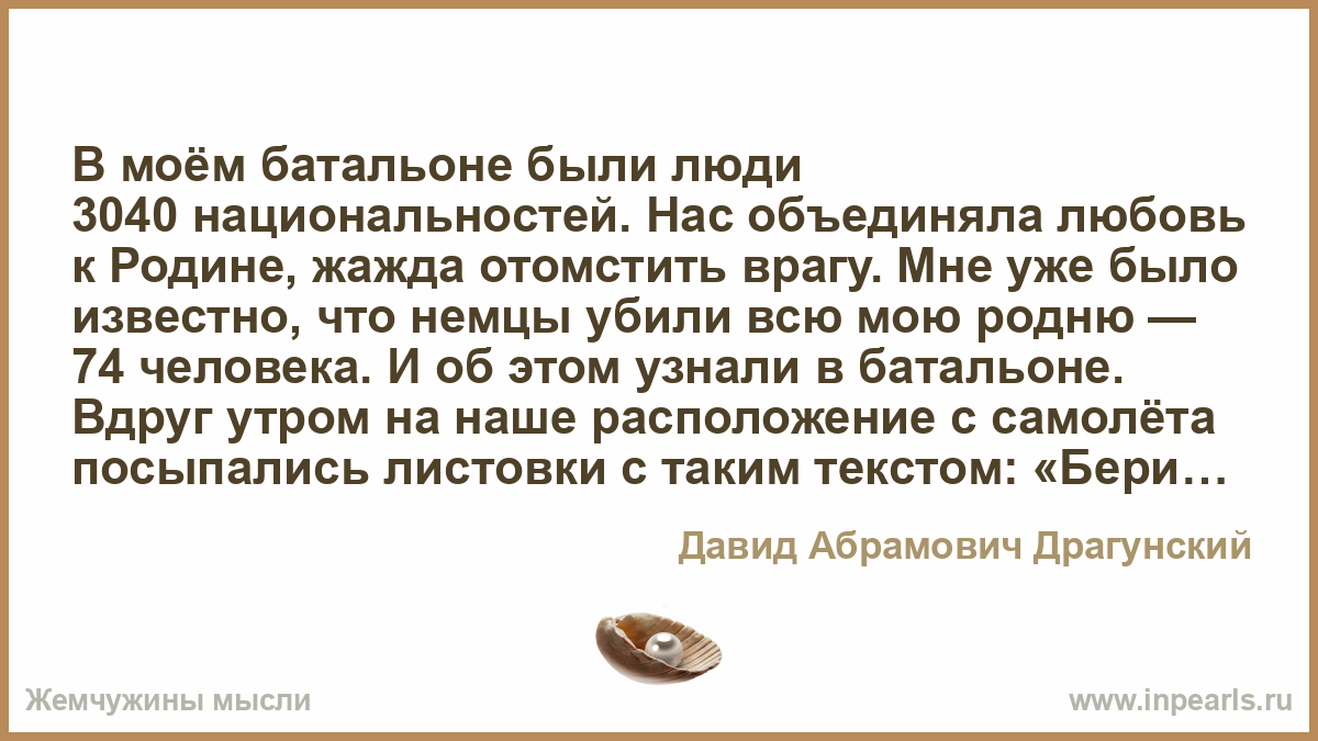 В моём батальоне были люди 30—40 национальностей. Нас объединяла любовь к Родине, жажда отомстить врагу. Мне уже было известно, что немцы убили всю мою родню — 74 человека. И об этом узнали в батальоне. Вдруг утром на наше расположение с самолёта посыпались листовки с таким текстом: «Бери хворостину и гони жидов в Палестину!» Солдаты, прочитав их, пришли ко мне и сказали: «Хватит ждать, командир! Веди нас в бой!» И с возгласами «Отомстим за семью Драгунского!» кинулись на расположение фашистов, и вскоре мы освободили несколько деревень… (Д.А.Драгунский)
