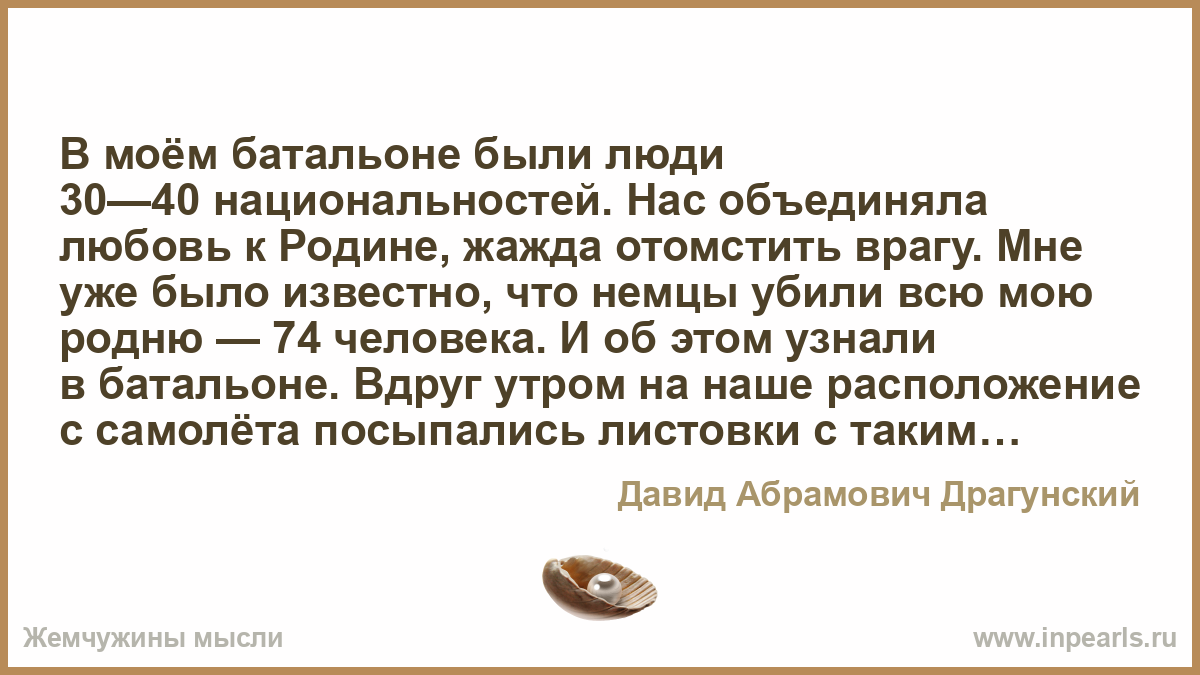 В моём батальоне были люди 30—40 национальностей. Нас объединяла любовь к Родине, жажда отомстить врагу. Мне уже было известно, что немцы убили всю мою родню — 74 человека. И об этом узнали в батальоне. Вдруг утром на наше расположение с самолёта посыпались листовки с таким текстом: «Бери хворостину и гони жидов в Палестину!» Солдаты, прочитав их, пришли ко мне и сказали: «Хватит ждать, командир! Веди нас в бой!» И с возгласами «Отомстим за семью Драгунского!» кинулись на расположение фашистов, и вскоре мы освободили несколько деревень… (Д.А.Драгунский)