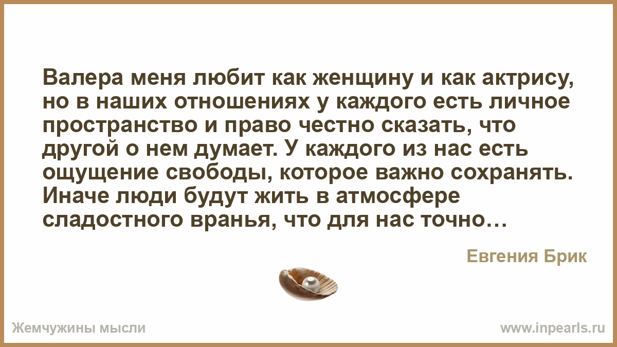 Валера меня любит как женщину и как актрису, но в наших отношениях у каждого есть личное пространство и право честно сказать, что другой о нем думает. У каждого из нас есть ощущение свободы, которое важно сохранять. Иначе люди будут жить в атмосфере сладостного вранья, что для нас точно неприемлемо. Я всегда могу сказать Валере, что думаю о его работе, а он-о моей. И я всегда знаю, что если у него есть для меня роль, то он вызовет меня на пробы, а если он не видит меня в своем фильме, значит, не будет снимать.