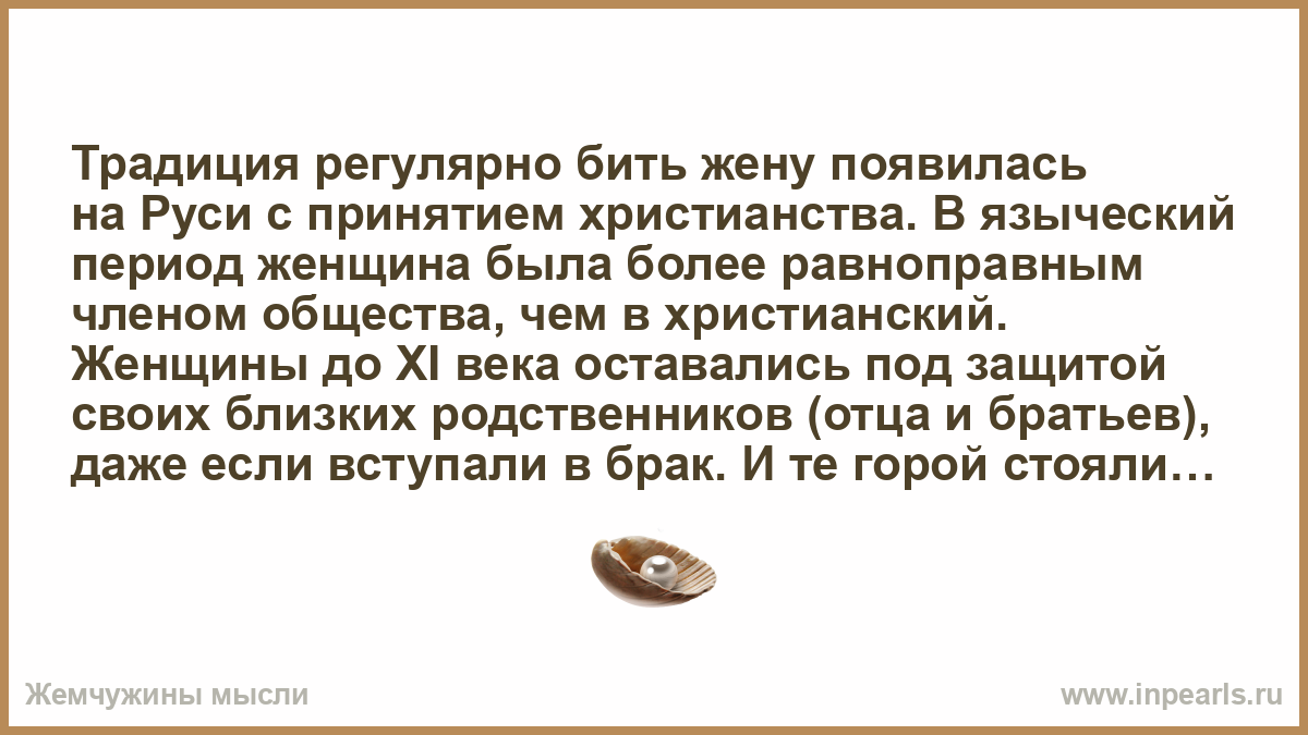 Чтобы душа женщины не попала в ад, муж был просто обязан регулярно «наущать» ее «битием». Телесные наказания считались чем-то вроде профилактической работы. Они должны были выбить из женщины все те пороки, которыми она по определению была наделена с рождения. Если мужчина бил супругу, значит, заботился о спасении ее души от адского пламени. Сами женщины так усвоили этот урок, что отсутствие побоев воспринимали как признак отсутствия мужниной любви и заботы. Такие законы семейной жизни были отражены в известном литературном памятнике «Домострое». Как бить жену «Домострой» был создан неизвестными авторами приблизительно в XV-XVI веках в Новгородской республике. По мнению исследовавших этот документ Александра Сергеевича Орлова, Сергея Михайловича Соловьева и других русских литературоведов и историков, «Домострой» стал результатом труда множества священников, «учителей народа», и одновременно квинтэссенцией моральных норм общества того периода. В этом документе делу «воспитания жены» посвящена не одна глава. Анонимный советчик поучает добропорядочных мужчин, как правильно бить жену, чтобы не наносить ей тяжелые увечья. Мужчине не рекомендовалось бить женщину по глазам, ушам и другим важным частям тела, чтобы не сделать супругу калекой. Также не следовало использовать для «воспитания» тяжелых и особенно металлических предметов, поскольку все это может привести к инвалидности. Физические методы воспитания по «Домострою» полагалось применять не только к женам, но и к детям, слугам и нерадивым работникам. Регулярное поколачивание всех этих людей — иногда просто так, в профилактических целях — было святой обязанностью мужчины, как главы семьи. Таким образом он, как прилежный пастырь, заботился о своем «стаде». Не бьет — значит, не любит Именно так воспринимали русские женщины более лояльное к себе отношение. Сейчас это может показаться странным и диким, но нельзя забывать, что женщина воспитывалась в патриархальном обществе. Всю ее жизнь регулировали суровые законы семьи, рода. Русские женщины в подавляющем большинстве своем были необразованными, с узким кругозором. Им и невдомек было то, что жить в семье можно как-то иначе. Да и примеров таких не было. Если женщине случалось — крайне редко — выйти замуж за иностранца, она вполне естественно воспринимала отсутствие побоев со стороны мужа как признак его нелюбви. Со временем в обществе было забыто исконное значение телесного наказания как способа воспитания «в страхе божьем». Мужчины стали бить жен просто из ревности или своеволия. Хуже всего, что сами женщины по-прежнему воспринимают такое поведение как норму и годами терпят рукоприкладство. Мнение психологов В русском обществе очень сильны традиции. Даже самые дикие и абсурдные. Память предков диктует русским женщинам молча терпеть побои и не выносить проблему на суд публики. Это меньше принято в интеллигентных семьях; чаще встречается в низших слоях населения. В последних регулярные побои могут быть отягощены пьянством и часто накладываются на другие виды насилия (моральное, сексуальное). Как бы женщины ни считали, что «бьет — значит, любит», насилие — это только насилие. Зачастую опустившийся мужчина продолжает жить с давно нелюбимой женщиной и при этом бить он ее тоже продолжает. Ни о какой любви в таких семьях р