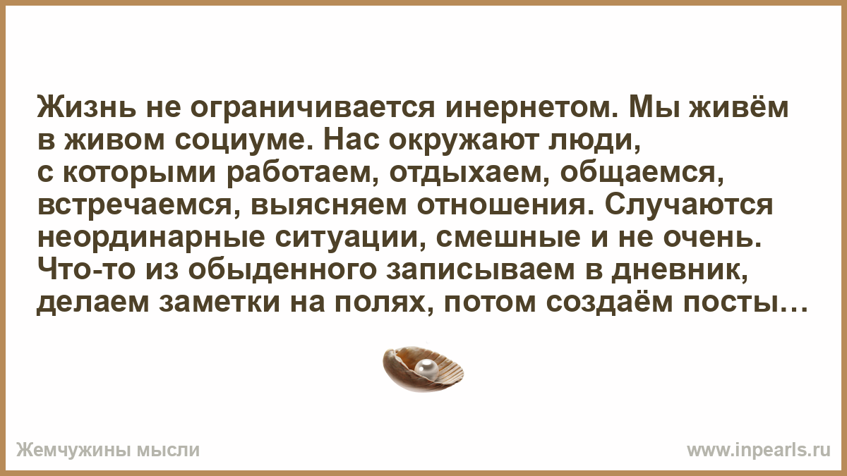 Жизнь не ограничивается инернетом. Мы живём в живом социуме. Нас окружают люди, с которыми работаем, отдыхаем, общаемся, встречаемся, выясняем отношения. Случаются неординарные ситуации, смешные и не очень. Что-то из обыденного записываем в дневник, делаем заметки на полях, потом создаём посты на виртуальных ресурсах. И кто-то обязательно примеряет это на себя. Гвоздём раздора царапает своё суждение на заборе, о том, что задето его самолюбие.