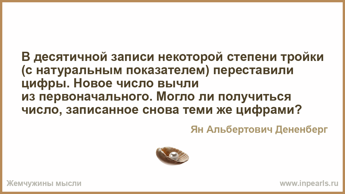 В десятичной записи некоторой степени тройки (с натуральным показателем) переставили цифры. Новое число вычли из первоначального. Могло ли получиться число, записанное снова теми же цифрами?