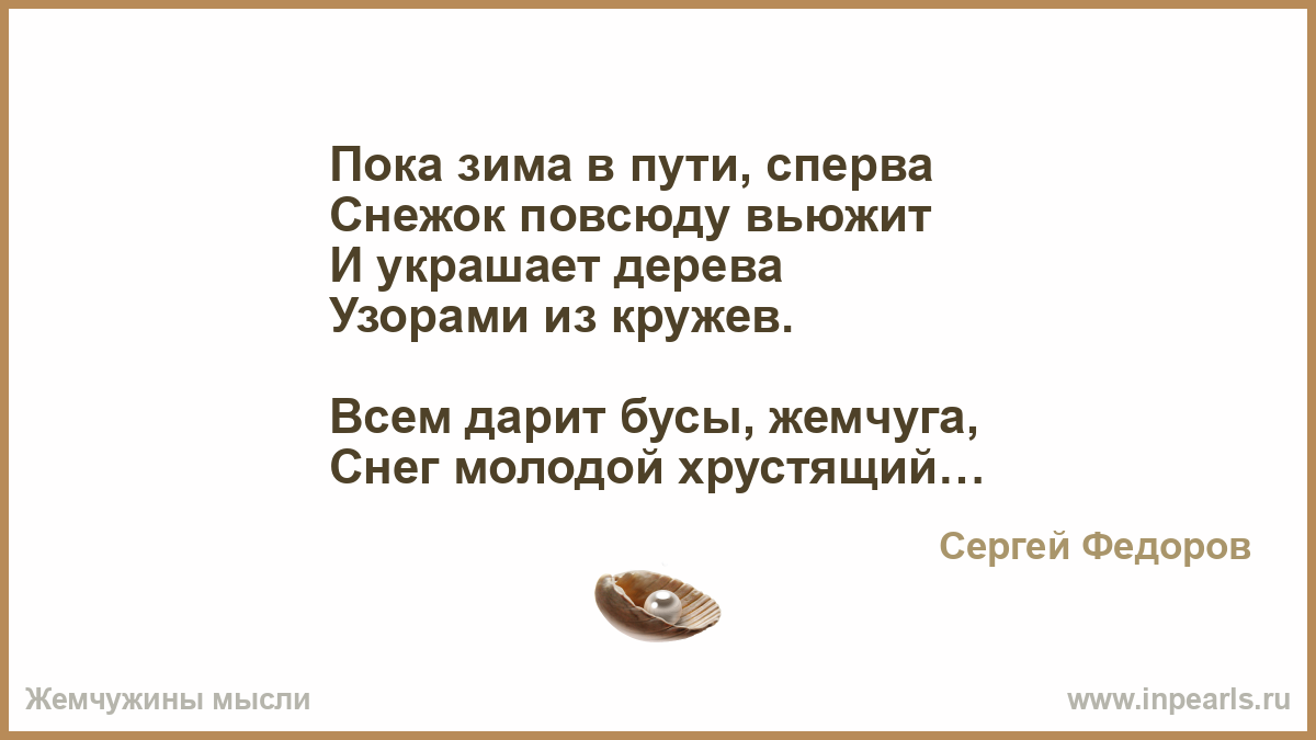 Пока есть зачем — встречайтесь, Если есть куда — стремитесь, И почаще улыбаясь, На судьбу… поменьше злитесь.