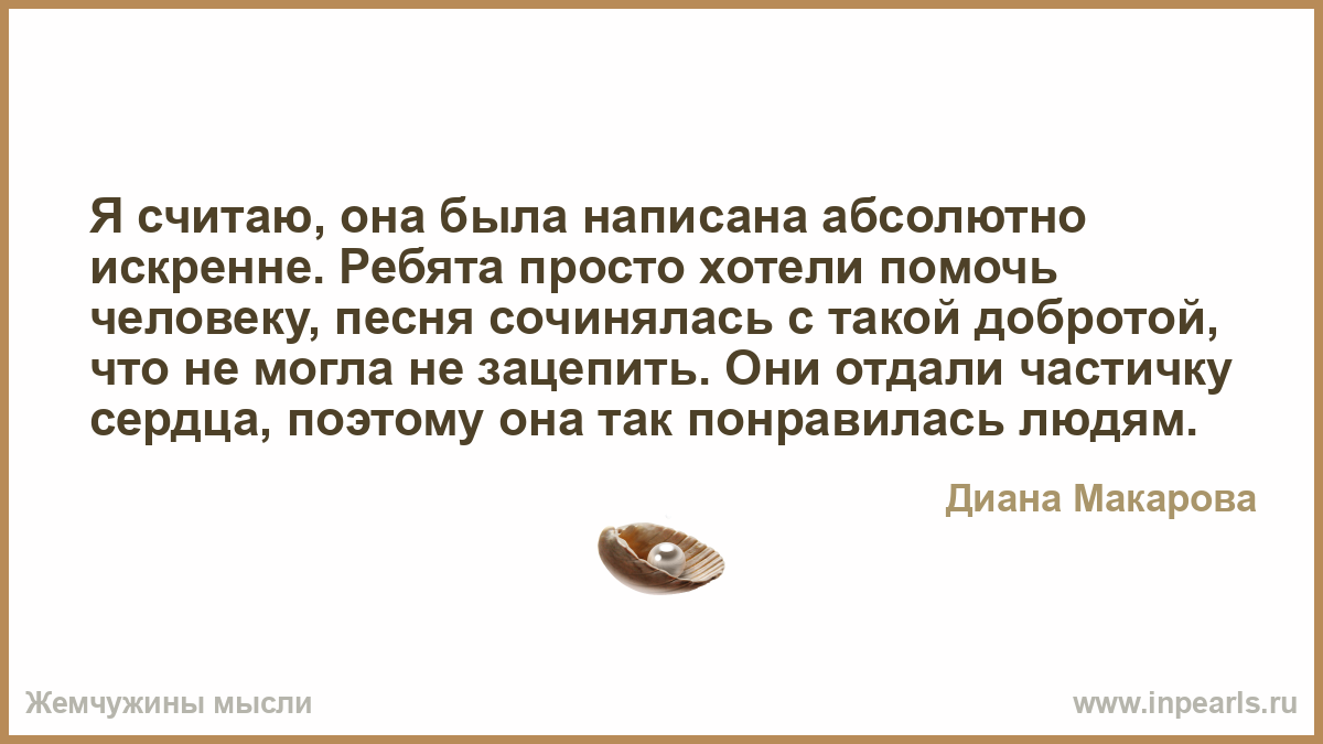 Я считаю, она была написана абсолютно искренне. Ребята просто хотели помочь человеку, песня сочинялась с такой добротой, что не могла не зацепить. Они отдали частичку сердца, поэтому она так понравилась людям.