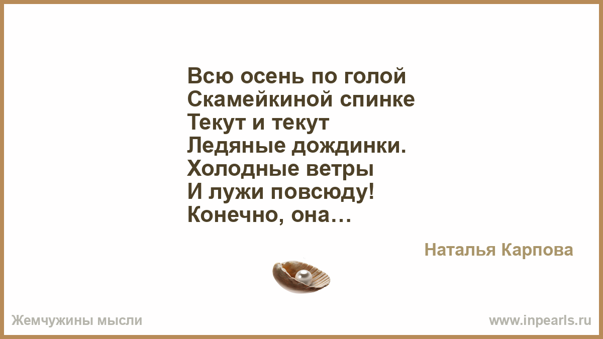 Осень — время мечтать и смотреть разноцветные сны, Запивать холода самым лучшим жасминовым чаем, Не испытывать сплин или ложное чувство вины От того, что дожди ну нисколечко не огорчают! Осень — время зонтов, что давно застоялись в углу. Время новых плащей, сапогов в разноцветную клетку — Чтобы лично узнать глубину и количество луж, А не грустно вздыхать и скучать по ушедшему лету. Осень — время стихов с неизбежным наличием фраз Об унылой поре, листопаде, капризах погоды… Осень — повод подумать, почувствовать «здесь» и «сейчас», И, конечно, любить вопреки всем законам природы!