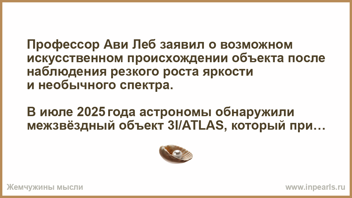 Профессор Ави Леб из Гарвардского университета, главный научный сотрудник проекта «Галилео», прямо заявил: «Аномальное поведение 3I/ATLAS, включая его гигантские размеры и необъяснимые изменения яркости, позволяет серьёзно рассматривать версию о его искусственном происхождении. Мы не можем исключать, что наблюдаем внеземной космический аппарат».