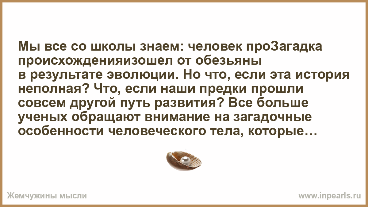 Мы все со школы знаем: человек проЗагадка происхожденияизошел от обезьяны в результате эволюции. Но что, если эта история неполная? Что, если наши предки прошли совсем другой путь развития? Все больше ученых обращают внимание на загадочные особенности человеческого тела, которые не укладываются в традиционную теорию. И их аргументы заставляют серьезно задуматься.
