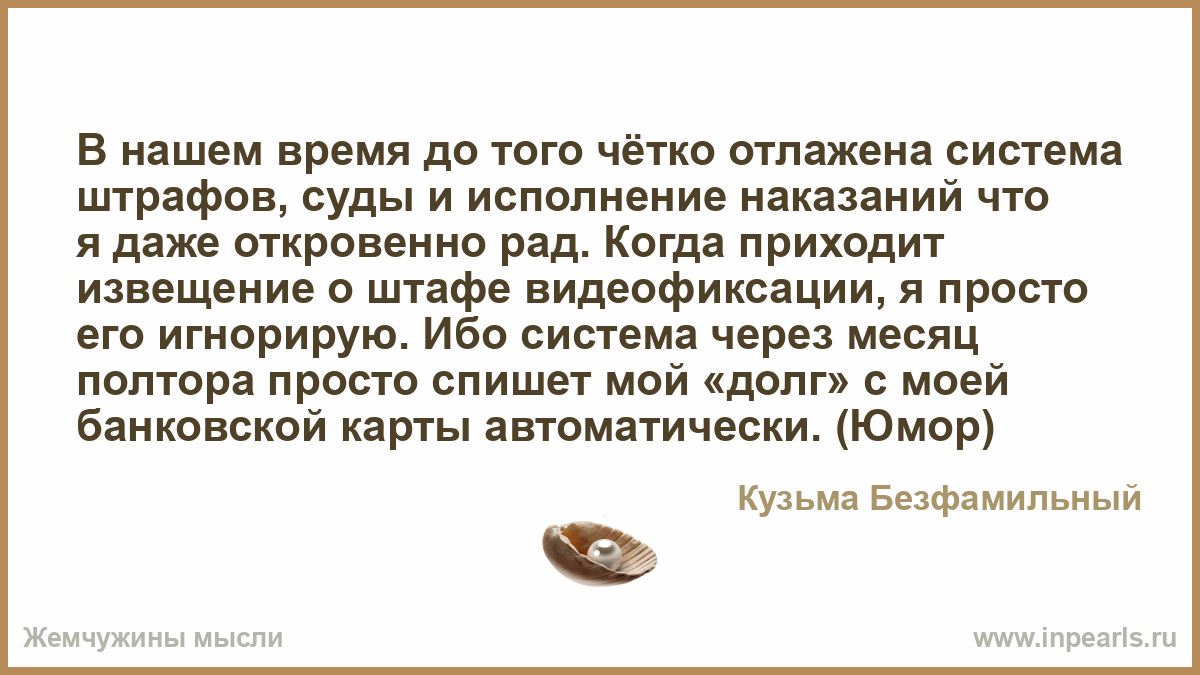В нашем время до того чётко отлажена система штрафов, суды и исполнение наказаний что я даже откровенно рад. Когда приходит извещение о штафе видеофиксации, я просто его игнорирую. Ибо система через месяц полтора просто спишет мой «долг» с моей банковской карты автоматически. (Юмор)