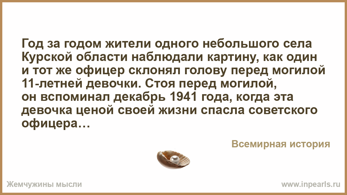 Год за годом жители одного небольшого села Курской области наблюдали картину, как один и тот же офицер склонял голову перед могилой 11-летней девочки. Стоя перед могилой, он вспоминал декабрь 1941 года, когда эта девочка, ценой своей жизни спасла советского офицера.