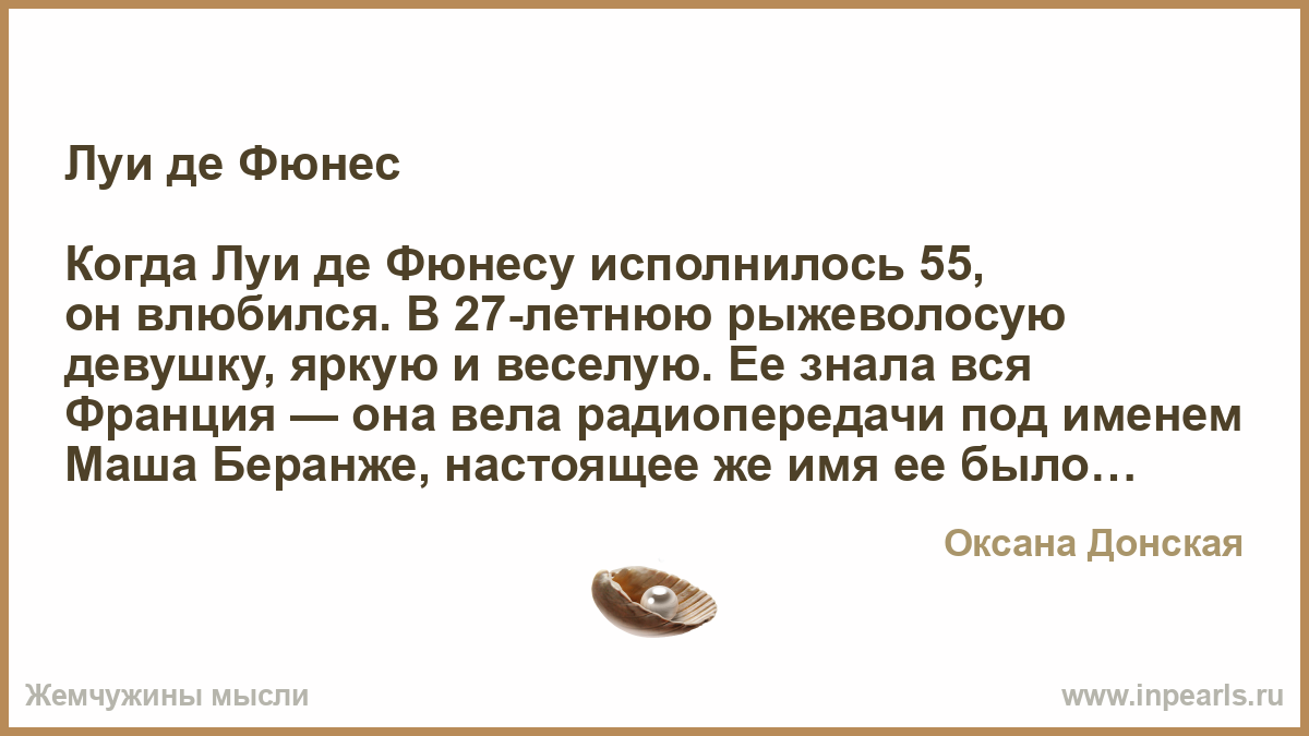 Когда Луи де Фюнесу исполнилось 55, он влюбился. В 27-летнюю рыжеволосую девушку, яркую и веселую. Ее знала вся Франция — она вела радиопередачи под именем Маша Беранже, настоящее же имя ее было Мишель Рионд.