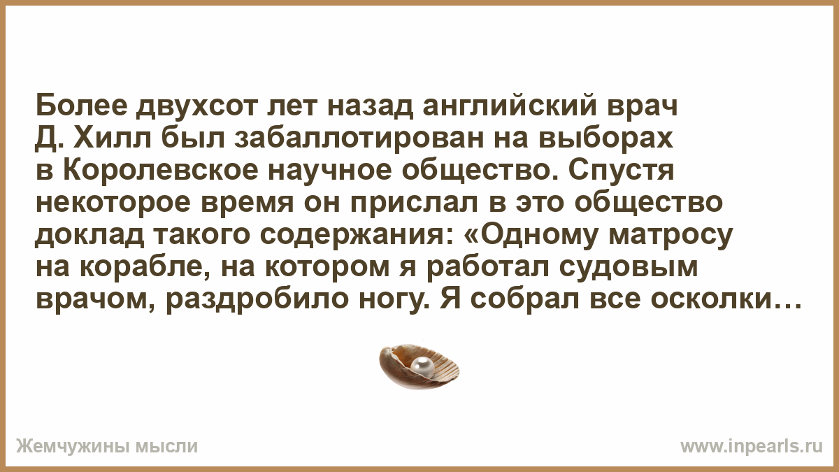 Более двухсот лет назад английский врач Д. Хилл был забаллотирован на выборах в Королевское научное общество. Спустя некоторое время он прислал в это общество доклад такого содержания: «Одному матросу на корабле, на котором я работал судовым врачом, раздробило ногу. Я собрал все осколки, уложил их как следует и полил смолой и подсмольной водой, получающейся при перегонке смолы. Вскоре осколки соединились, и матрос смог ходить, как будто ничего не случилось…». В то давнее время Королевское общество много рассуждало о целебных свойствах подсмольной воды и дегтя. Сообщение доктора Д. Хилла вызвало большой интерес и было зачитано на одной из научных сессий. Через несколько дней Д. Хилл прислал обществу дополнительное сообщение: