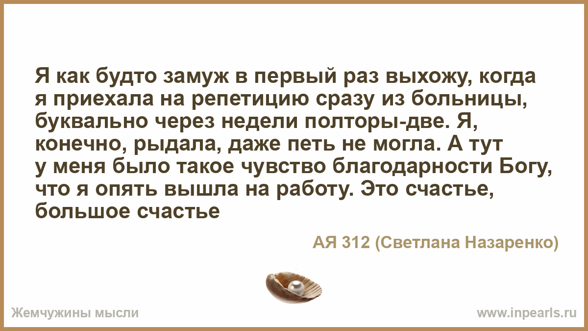 Я как будто замуж в первый раз выхожу, когда я приехала на репетицию сразу из больницы, буквально через недели полторы-две. Я, конечно, рыдала, даже петь не могла. А тут у меня было такое чувство благодарности Богу, что я опять вышла на работу. Это счастье, большое счастье