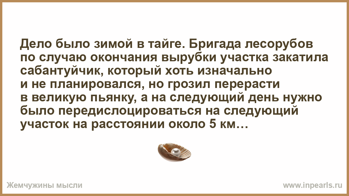 Дело было зимой в тайге. Бригада лесорубов по случаю окончания вырубки участка закатила сабантуйчик, который хоть изначально и не планировался, но грозил перерасти в великую пьянку, а на следующий день нужно было передислоцироваться на следующий участок на расстоянии около 5 км.