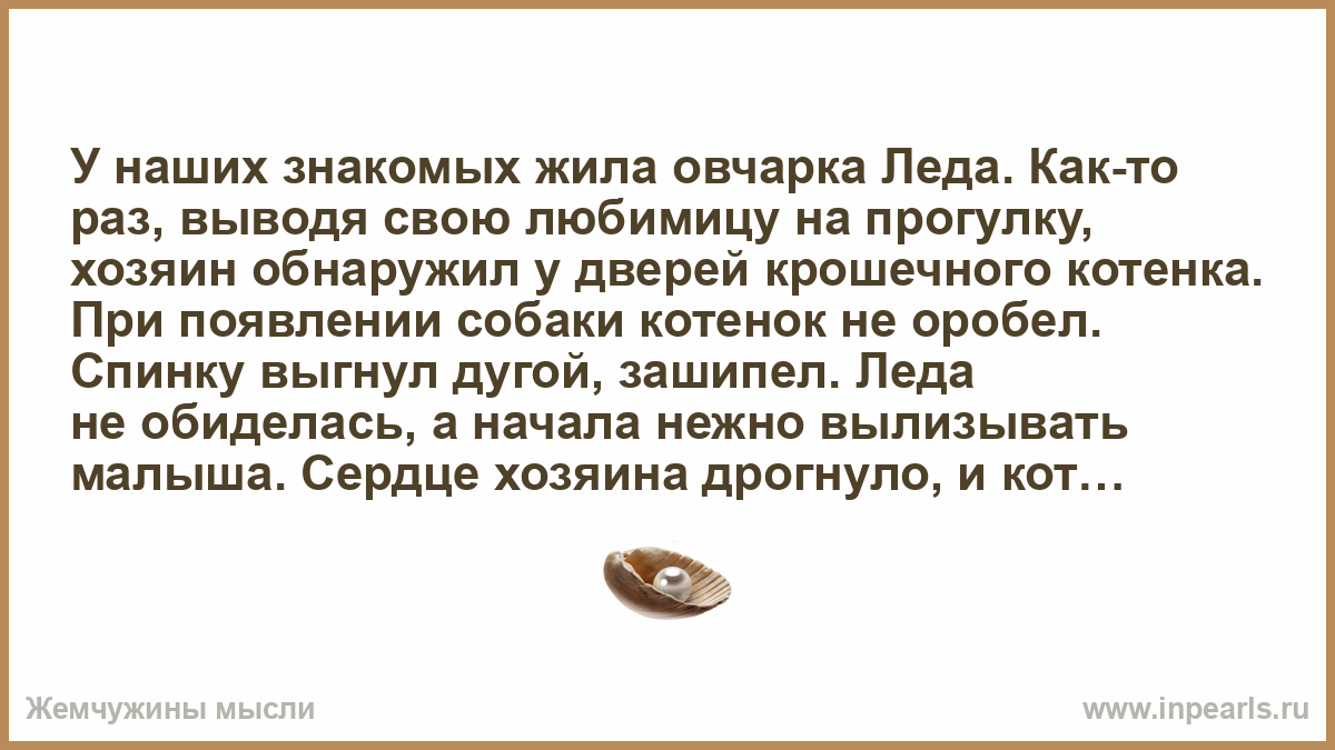 У наших знакомых жила овчарка Леда. Как-то раз, выводя свою любимицу на прогулку, хозяин обнаружил у дверей крошечного котенка. При появлении собаки котенок не оробел. Спинку выгнул дугой, зашипел. Леда не обиделась, а начала нежно вылизывать малыша. Сердце хозяина дрогнуло, и кот поселился в квартире, получив кличку «Полкан». Прошло время. Полкаша подрос.