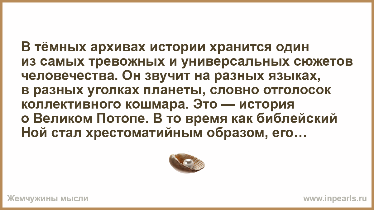 Учёные признают, что в далёком прошлом Земля переживала масштабные наводнения, но идея единого глобального потопа за последние шесть тысяч лет остаётся предметом дискуссий. Однако удивительное сходство мифов, разделённых океанами — от Шумера до Мезоамерики — продолжает будоражить умы. Оно наводит на мысль о некоем общем источнике, о реальной катастрофе такой силы, что её отпечаток остался в памяти всех народов мира.
