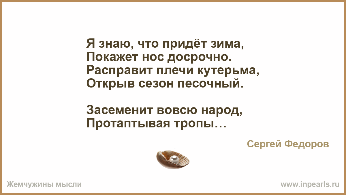 Пока есть зачем — встречайтесь, Если есть куда — стремитесь, И почаще улыбаясь, На судьбу… поменьше злитесь.