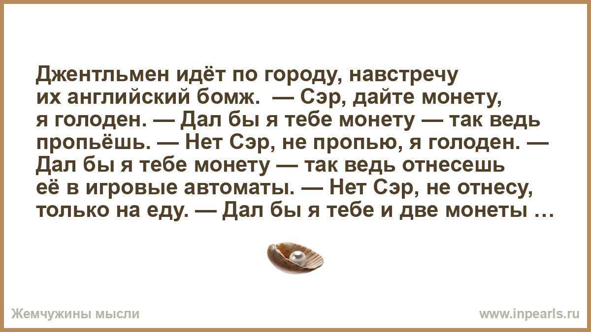 Джентльмен идёт по городу, навстречу их английский бомж. — Сэр, дайте монету, я голоден. — Дал бы я тебе монету — так ведь пропьёшь. — Нет Сэр, не пропью, я голоден. — Дал бы я тебе монету — так ведь отнесешь её в игровые автоматы. — Нет Сэр, не отнесу, только на еду. — Дал бы я тебе и две монеты — так ведь истратишь на женщин. — Нет Сэр, клянусь. — Слушай, а пойдём ко мне домой. — Что вы Сэр, я грязен, я не мыт… Дома ваша жена… — Да—да, жена, именно ей я и должен тебя показать. Я должен показать ей как выглядит человек, которого не интересуют ни алкоголь, ни женщины, ни игровые автоматы.