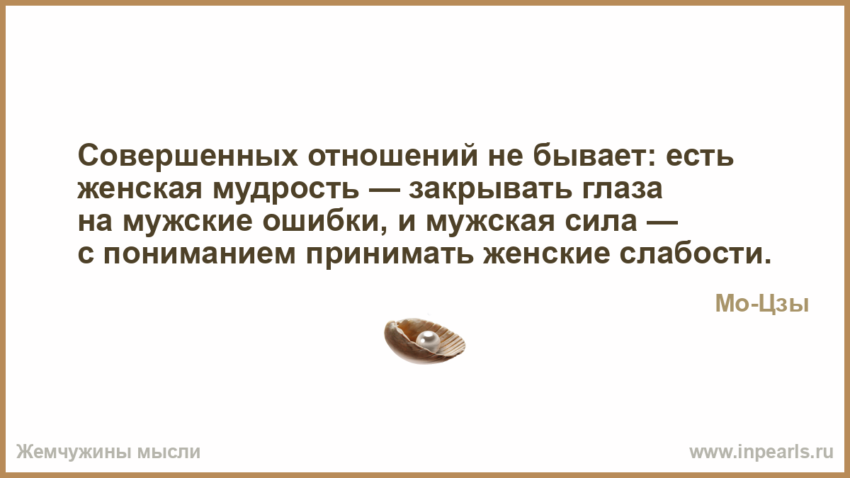 Совершенных отношений не бывает: есть женская мудрость — закрывать глаза на мужские ошибки, и мужская сила — с пониманием принимать женские слабости.