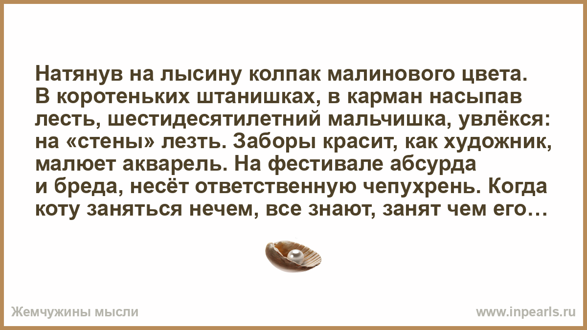 Натянув на лысину колпак малинового цвета. В коротеньких штанишках, в карман насыпав лесть, шестидесятилетний мальчишка, увлёкся: на «стены» лезть. Заборы красит, как художник, малюет акварель. На фестивале абсурда и бреда, несёт ответственную чепухрень. Когда коту заняться нечем, все знают, занят чем его язык. У балабола есть призвание: мозг пудрить тем, кто думать не привык.