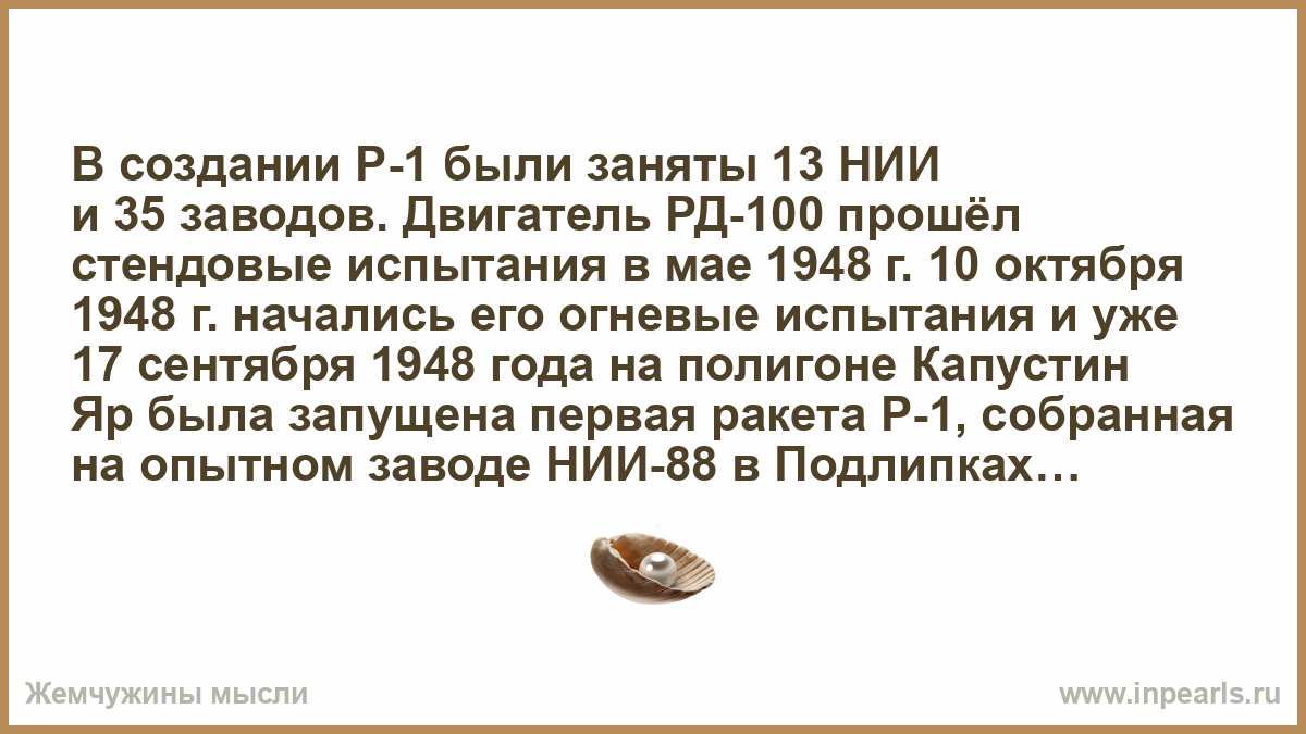 В создании Р-1 были заняты 13 НИИ и 35 заводов. Двигатель РД-100 прошёл стендовые испытания в мае 1948 г. 10 октября 1948 г. начались его огневые испытания и уже 17 сентября 1948 года на полигоне Капустин Яр была запущена первая ракета Р-1, собранная на опытном заводе НИИ-88 в Подлипках.