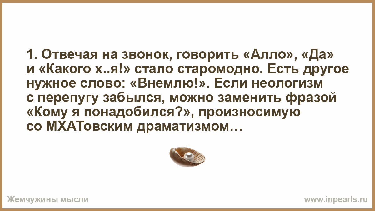 1. Отвечая на звонок, говорить «Алло», «Да» и «Какого х..я!» стало старомодно. Есть другое нужное слово: «Внемлю!». Если неологизм с перепугу забылся, можно заменить фразой «Кому я понадобился?», произносимую со МХАТовским драматизмом.