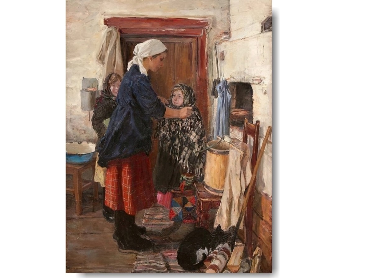 На полотне изображён трогательный момент из сельской жизни. В простой избе мать помогает детям собраться — вероятно, в школу или на улицу.