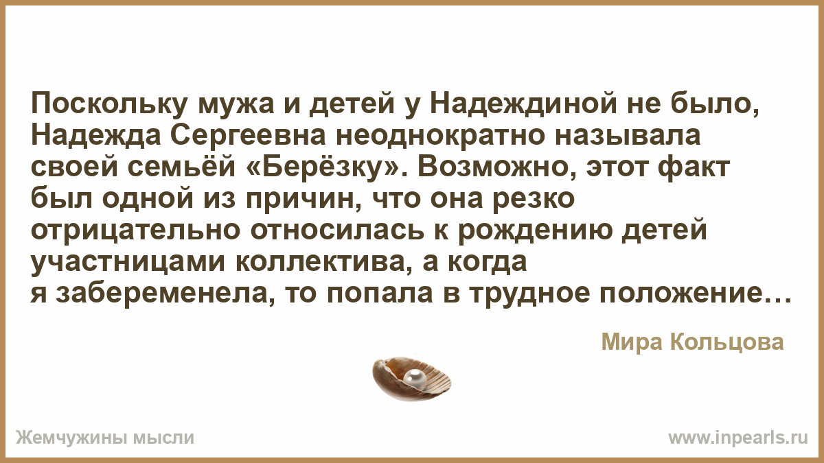 Поскольку мужа и детей у Надеждиной не было, Надежда Сергеевна неоднократно называла своей семьёй «Берёзку». Возможно, этот факт был одной из причин, что она резко отрицательно относилась к рождению детей участницами коллектива, а когда я забеременела, то попала в трудное положение. Уйти в декрет оказалось сложно, возник конфликт. Я танцевала до 6-го месяца беременности, потом родила сына назвала его Филиппом, но через месяц вернулась в коллектив, а мальчика воспитывала моя мама.