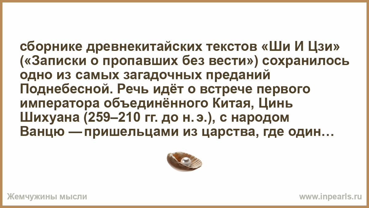 сборнике древнекитайских текстов «Ши И Цзи» («Записки о пропавших без вести») сохранилось одно из самых загадочных преданий Поднебесной. Речь идёт о встрече первого императора объединённого Китая, Цинь Шихуана (259–210 гг. до н. э.), с народом Ванцю — пришельцами из царства, где один день равен десяти тысячам земных лет.