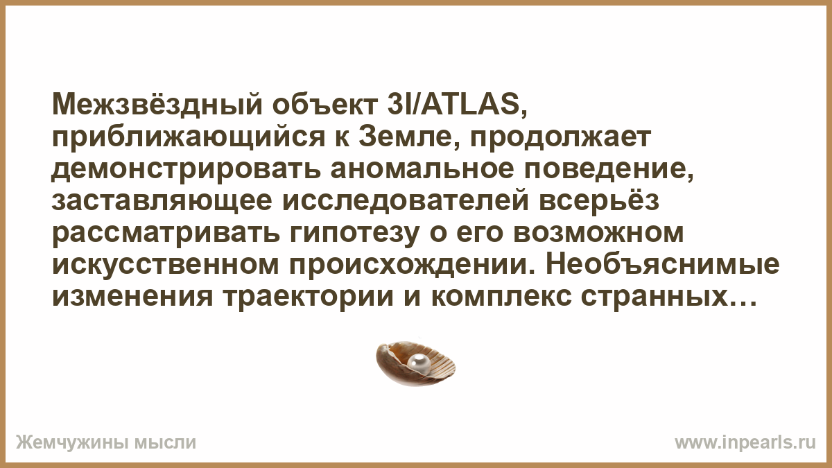 Межзвёздный объект 3I/ATLAS, приближающийся к Земле, продолжает демонстрировать аномальное поведение, заставляющее исследователей всерьёз рассматривать гипотезу о его возможном искусственном происхождении. Необъяснимые изменения траектории и комплекс странных характеристик ставят под сомнение первоначальную классификацию объекта как кометы.