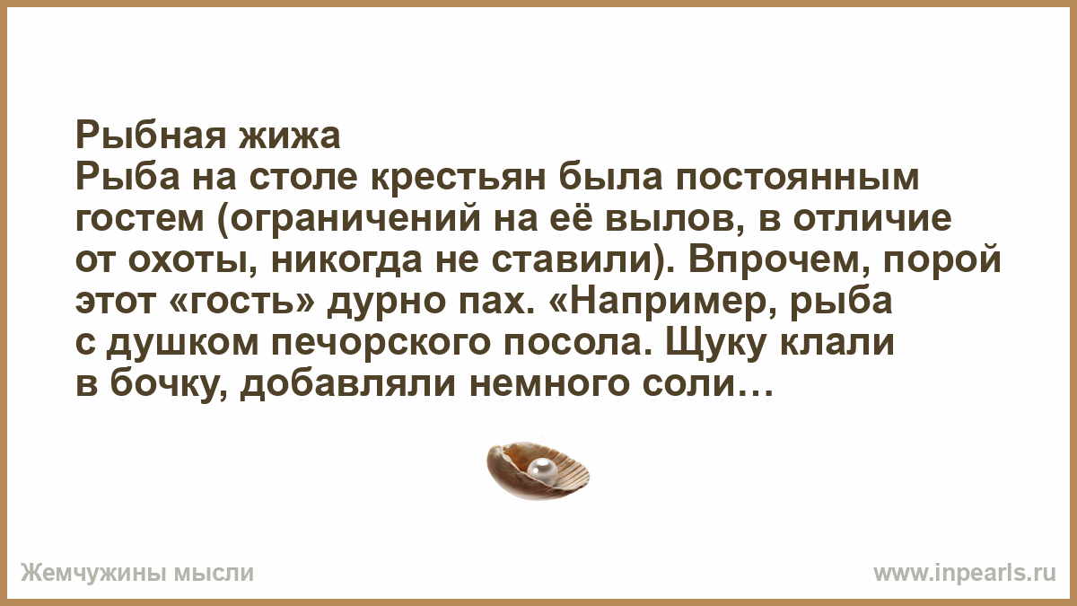 Рыба на столе крестьян была постоянным гостем (ограничений на её вылов, в отличие от охоты, никогда не ставили). Впрочем, порой этот «гость» дурно пах. «Например, рыба с душком печорского посола. Щуку клали в бочку, добавляли немного соли и можжевеловые шишки и ставили на несколько дней в тёплое место. Она получалась полусолёной, полуподтухшей. Ещё тот запах! Но когда привыкнешь, вкусно, — рассказывает директор подмосковного музея древнерусской кухни „Еда Руси“ Сергей Дмитриев. — А на Крайнем Севере в Мезенском районе речную рыбу квасили в ямах. Её выкапывали всей деревней, дно и стены обкладывали специальными листьями, закидывали туда рыбу, закрывали листьями и засыпали землёй. Через пару месяцев блюдо было готово. Черпали жижу вёдрами. Считали её вкуснятиной. Кстати, такая ферментированная рыба полезна».