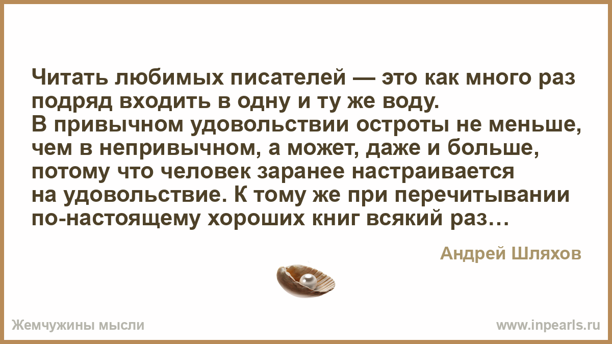 Читать любимых писателей — это как много раз подряд входить в одну и ту же воду. В привычном удовольствии остроты не меньше, чем в непривычном, а может, даже и больше, потому что человек заранее настраивается на удовольствие. К тому же при перечитывании по-настоящему хороших книг всякий раз открываются новые смыслы, отыскиваются новые оттенки.