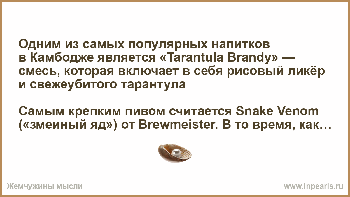 Одним из самых популярных напитков в Камбодже является «Tarantula Brandy» — смесь, которая включает в себя рисовый ликёр и свежеубитого тарантула