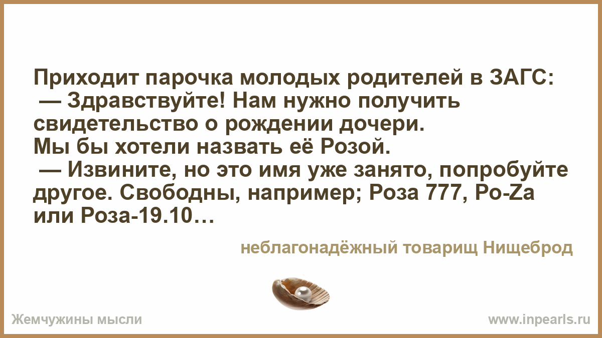 — Здравствуйте! Нам нужно получить свидетельство о рождении дочери. Мы бы хотели назвать её Розой.