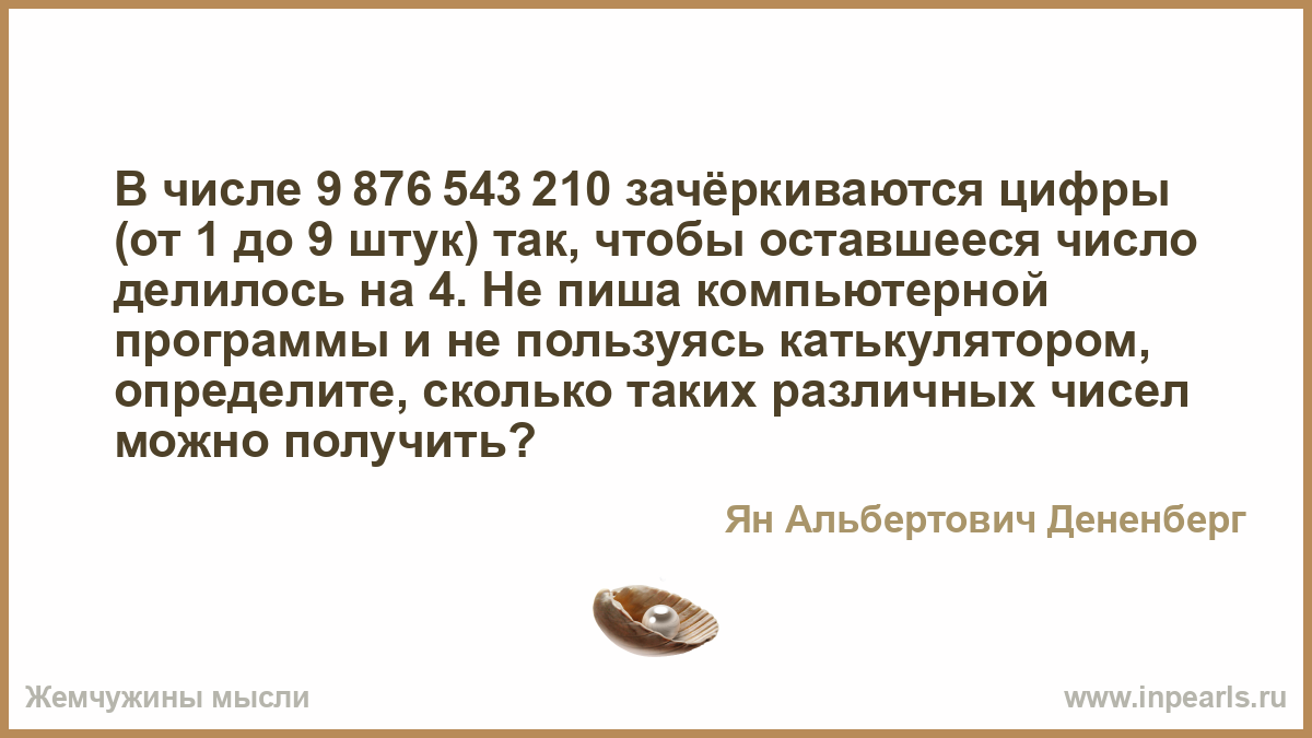 В числе 9 876 543 210 зачёркиваются цифры (от 1 до 9 штук) так, чтобы оставшееся число делилось на 4. Не пиша компьютерной программы и не пользуясь катькулятором, определите, сколько таких различных чисел можно получить?