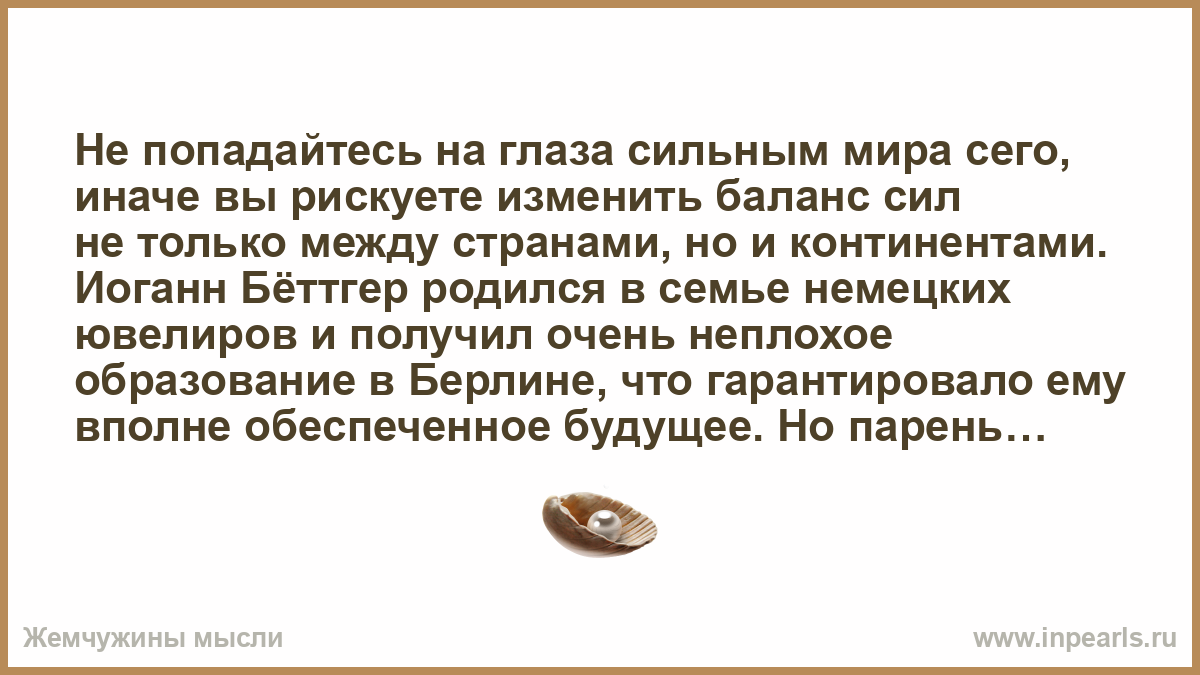 Не попадайтесь на глаза сильным мира сего, иначе вы рискуете изменить баланс сил не только между странами, но и континентами. Иоганн Бёттгер родился в семье немецких ювелиров и получил очень неплохое образование в Берлине, что гарантировало ему вполне обеспеченное будущее. Но парень решил заняться алхимией, на чём и погорел.