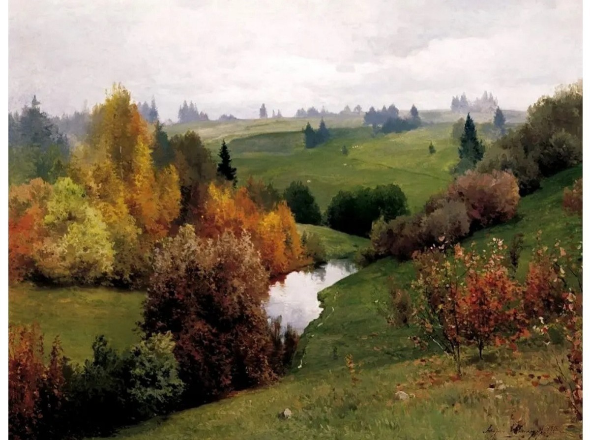 Художник мастерски использует мягкие переходы цвета: от сочных зелёных и жёлтых тонов до тёплых оранжевых и бурых оттенков осенней листвы. Пейзаж наполнен спокойствием и ощущением гармонии. Здесь нет человека — только природа, живая и вечная, дышащая свежестью и умиротворением.