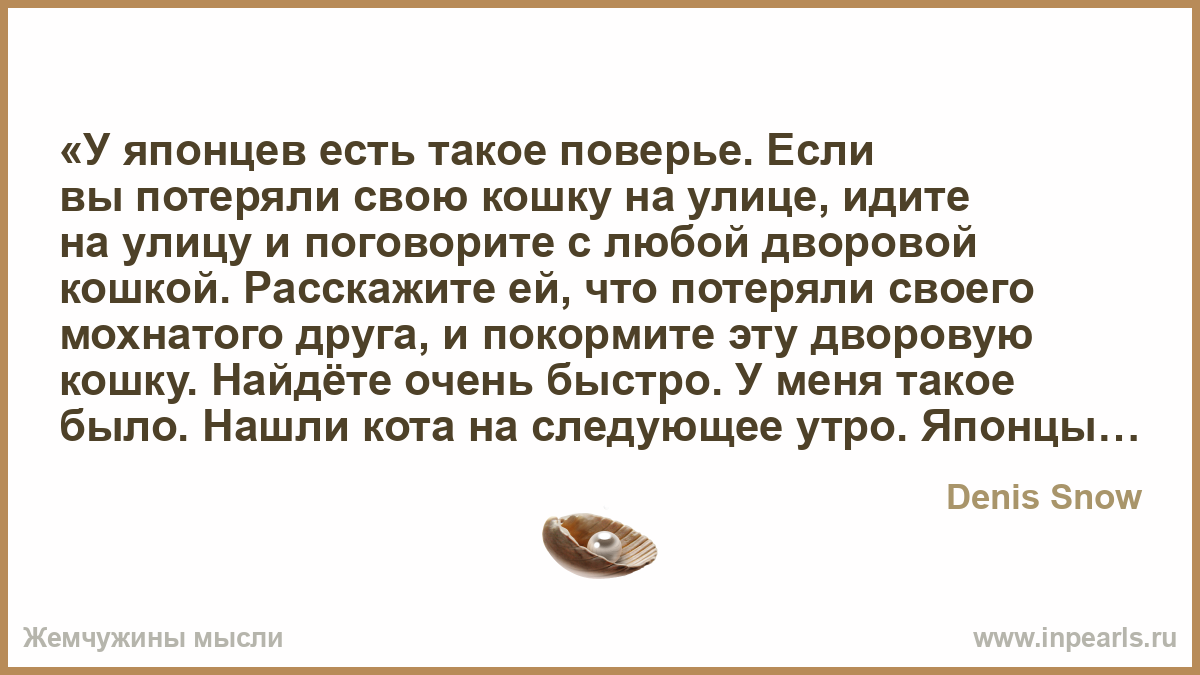 «У японцев есть такое поверье. Если вы потеряли свою кошку на улице, идите на улицу и поговорите с любой дворовой кошкой. Расскажите ей, что потеряли своего мохнатого друга, и покормите эту дворовую кошку. Найдёте очень быстро. У меня такое было. Нашли кота на следующее утро. Японцы верят, что у котов есть связь, как интернет, только на спиритуальном уровне. Это реально работает.