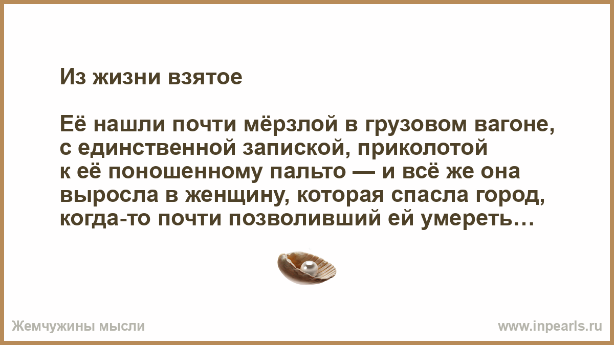 Железнодорожник услышал слабый плач из пустого товарного вагона и нашёл там девочку лет четырёх, с посиневшими от холода губами и дрожащими руками. К её старому пальто был приколот клочок бумаги: